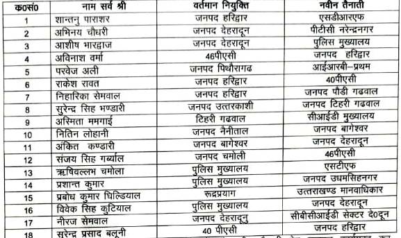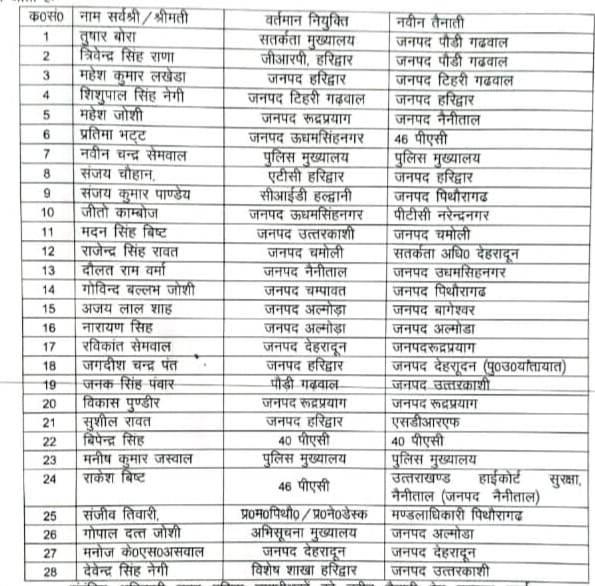 *पुलिस मुख्यालय, उत्तराखण्ड।* निम्नलिखित पुलिस उपाधीक्षकों को उनकी वर्तमान तैनाती से उनके नाम के सम्मुख अंकित नवीन तैनाती पर तत्काल प्रभाव से स्थानांतरित किया जाता है। made massive transfers of COs in the police department. Police Headquarters